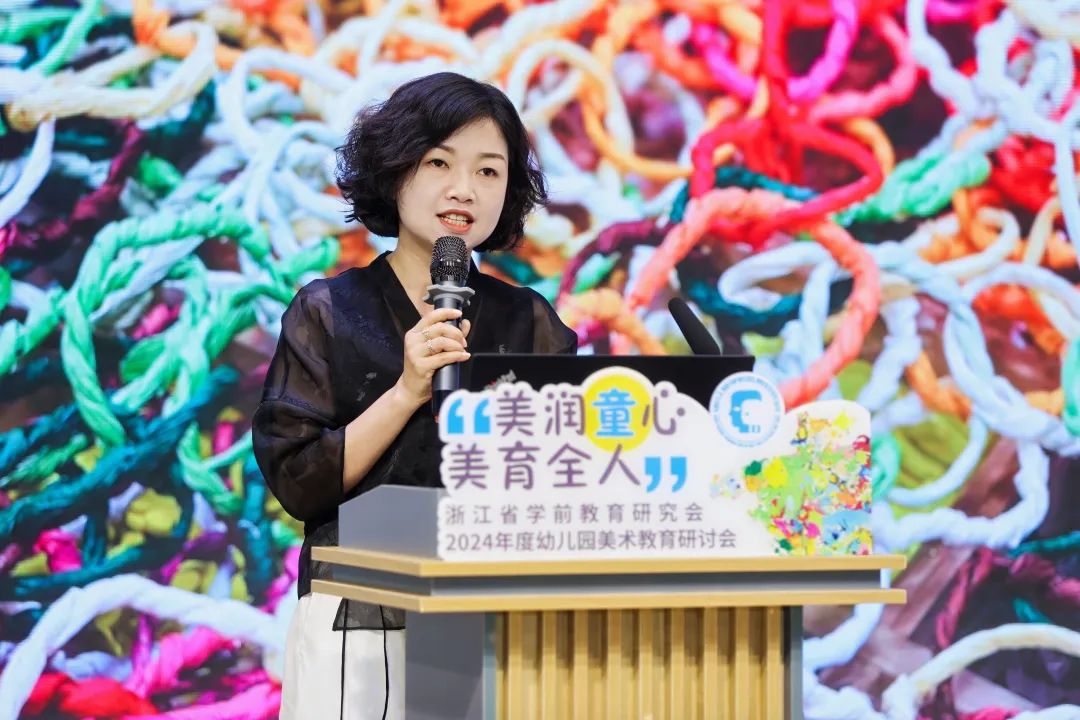 镇海区艺实幼儿园副园长陈卓尔老师分享幼儿园的绳编环境的创设实践。她详细介绍了幼儿园结合园本化的“创·美”课程,如何基于儿童需要与发展,从场域选建、材料投放与呈现等方面构建有“美”的绳编环境的实践经历。