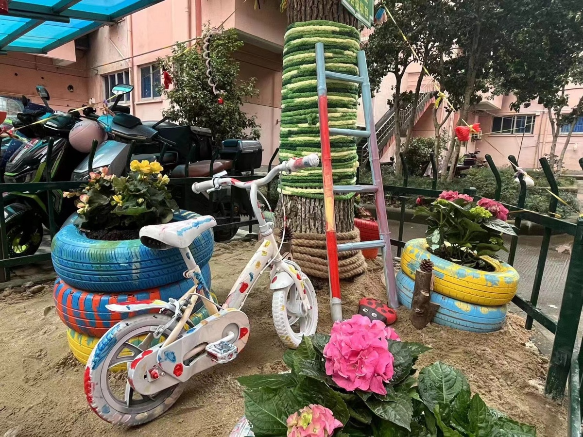 “保护环境从我做起!”这一句简单的口号被宁波市怡江幼儿园的孩子真真实实地落到生活之处。在红梅小区的街道上,一个个身影捡拾着落叶,一双双小手挥舞着创意,一张张笑脸洋溢着自豪。他们整理、筛选出可利用的废旧材料,如堆积在小区角落的轮胎、自行车、梯子,将它们进行改造、装饰、拼搭、重组,变成了社区中独特的风景线。孩子们的小手,犹如魔法师的魔杖,点亮了社区的每一个角落,让这个冬日里的红梅小区,充满了生机与希望。