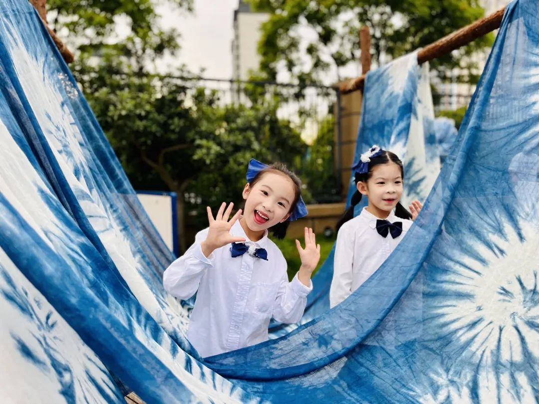玫瑰园的户外环境巧妙融入了玫瑰花元素,不仅为幼儿园增添了鲜艳的色彩,还成为孩子的创美活动和户外游戏灵感的源泉。在玫瑰花的环绕下,孩子们尽情挥洒想象力和创造力,为玫瑰园注入了生命力和活力。每一朵玫瑰花都象征着美好和希望,在玫瑰园的呵护下,孩子们学会了欣赏美和创造美。在玫瑰花的陪伴下,孩子们健康、自信地成长。2.“创·美”游戏工坊——①【“绘声绘色”彩绘坊】在彩绘坊,孩子们拥有宽敞明亮的玩色空间,他们可以在彩绘坊追逐色彩变化,同时感受光影流动带来的视觉盛宴,激发对玩色的兴趣。这里的扎染艺术品在各个角落以各种形式呈现,一眼望去,艺术之美尽在那“蓝白”之间。
